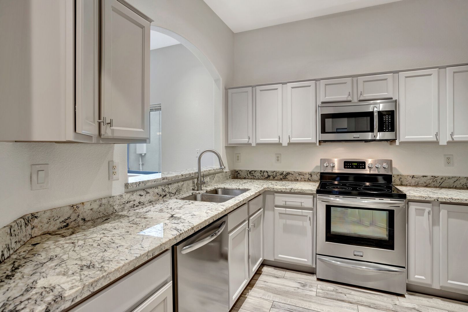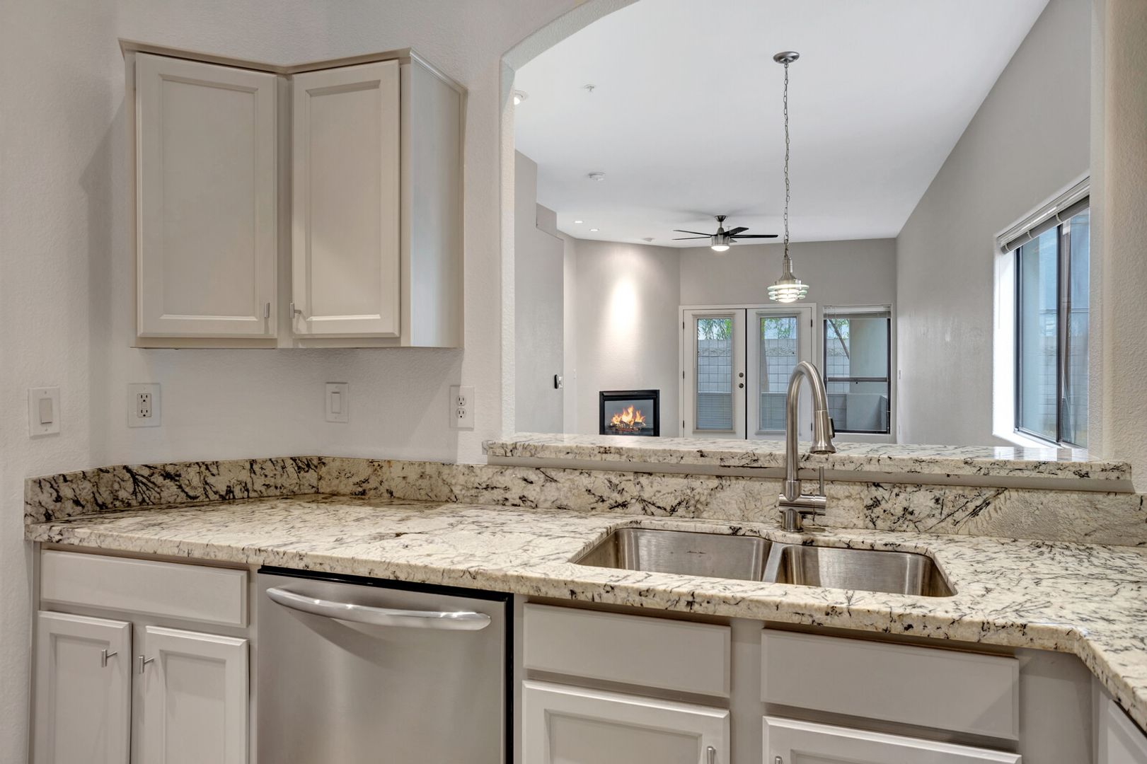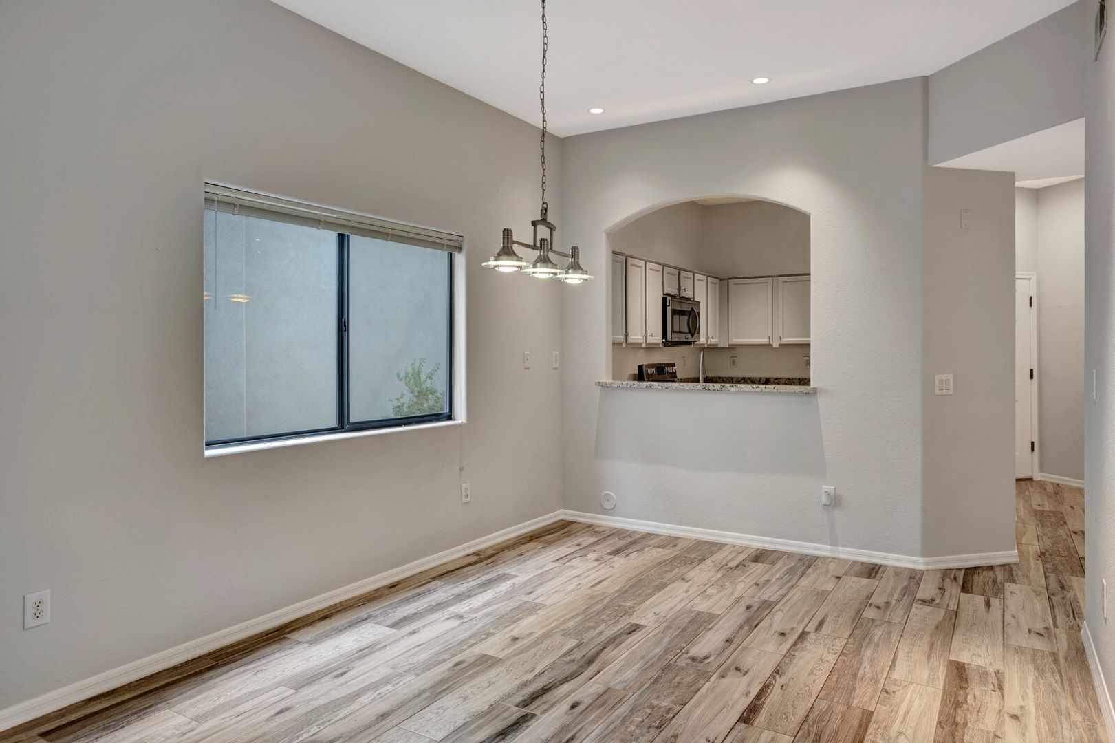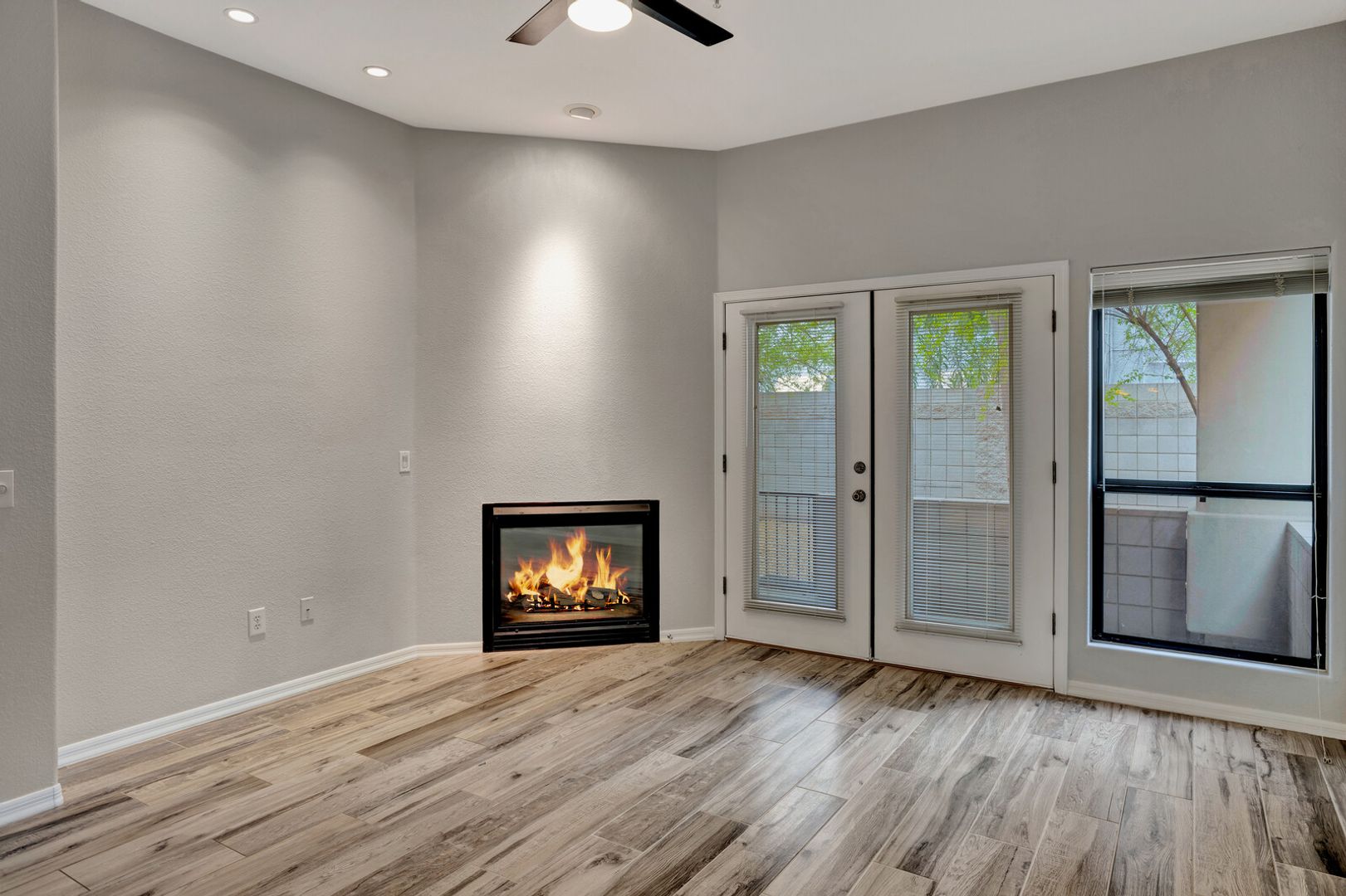 2 Bed 2 bath remodeled Townhouse W/ 1 car attached garage W direct access to house, no stairs. Open & Bright W/12 ft. ceilings, upgraded wood plank tile, gas fireplace, & covered private patio backing to open space. Master suite features french doors with access to patio, walk-in -closet, his/hers sinks, and refinished stand up shower. Open kitchen W/ Breakfast bar, granite, & stainless appliances. Located in the gated community of the Enclave, & just steps from heated pool/jacuzzi. Full size washer dryer & refrigerator included. Prime location and close to Biltmore. Condo has 1 car attached garage, & ALL OF THE COVERED PARKING SPOTS ARE NOT RESERVED, AND ARE AVAILABLE ON FIRST COME FIRST SERVE BASIS. TENANT WILL BE PROVIDED A PASS TO PLACE IN VEHICLE TO ALLOW THEM TO PARK IN COVERED SPOTS. $399 Non refundable cleaning fee and $50 new tenant admin fee. Application fee $90