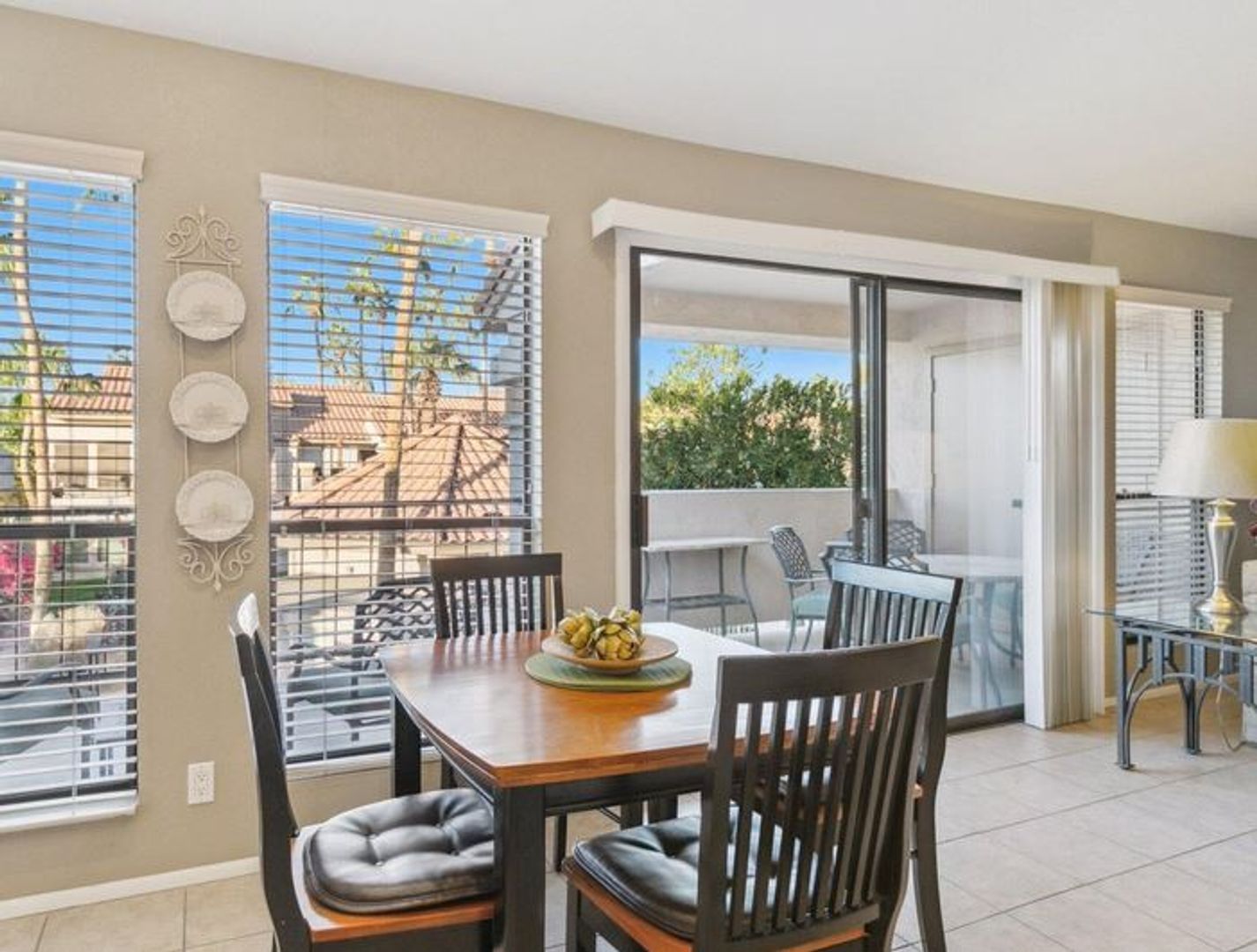 PROFESSIONAL PICTURES COMING AFTER NEW CARPET IS INSTALLED. Furnished 1 bed 1 bath in the gated community of The Racquet Club. Resort like community with 5 pools, 6 jacuzzi's, 9 tennis courts, 24/7 secured gates, clubhouse, fitness center. Condo features open floor plan with granite counters, private corner patio with pool and tennis view, new carpet, tiled walk in shower w/large closet, king bed & separate water closet. Faces pool, and adjacent to tennis court. Full size washer and dryer, fully furnished, with one covered parking spot. Nobody above. Non refundable Cleaning fee $299 and $50 admin. $90 application fee.