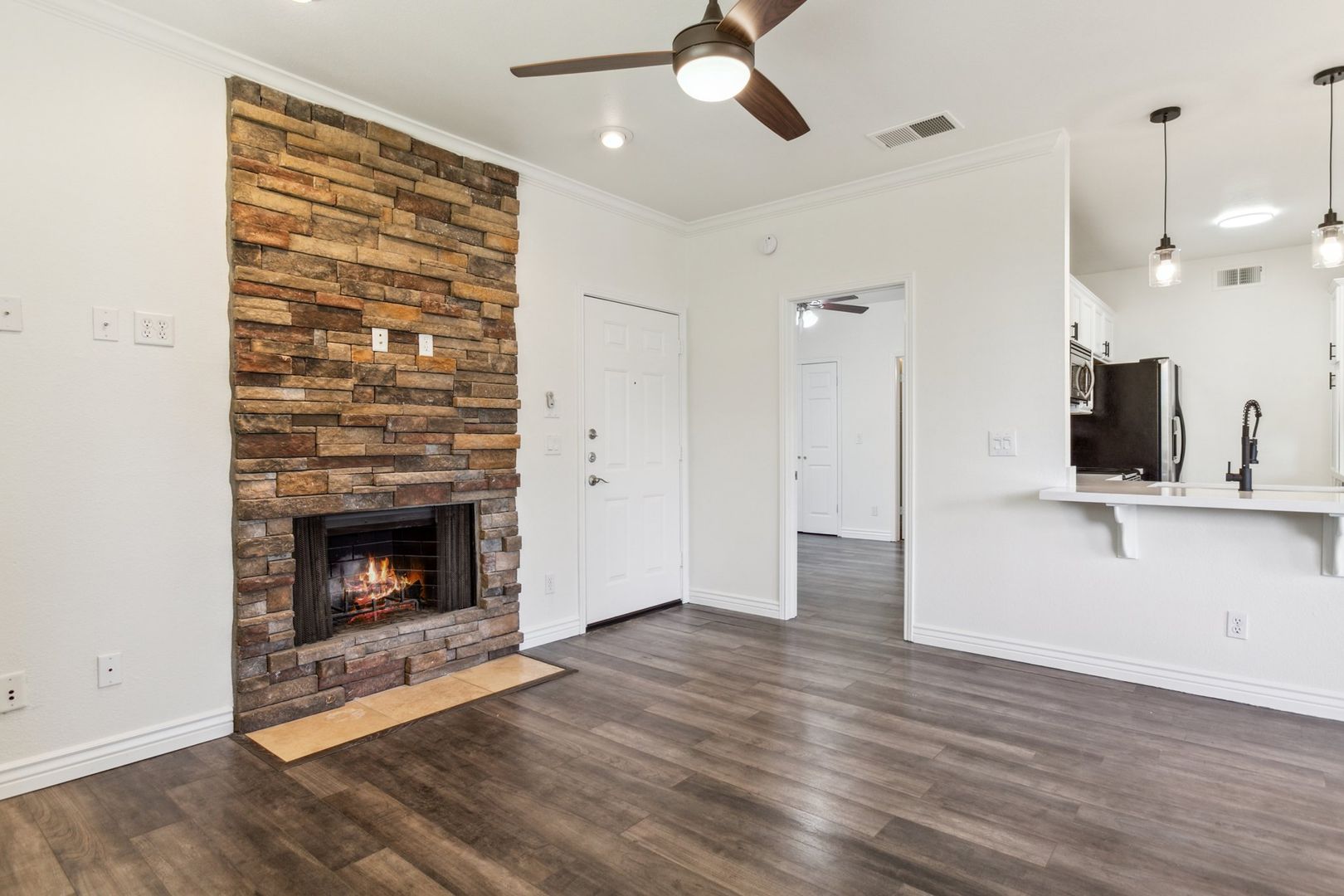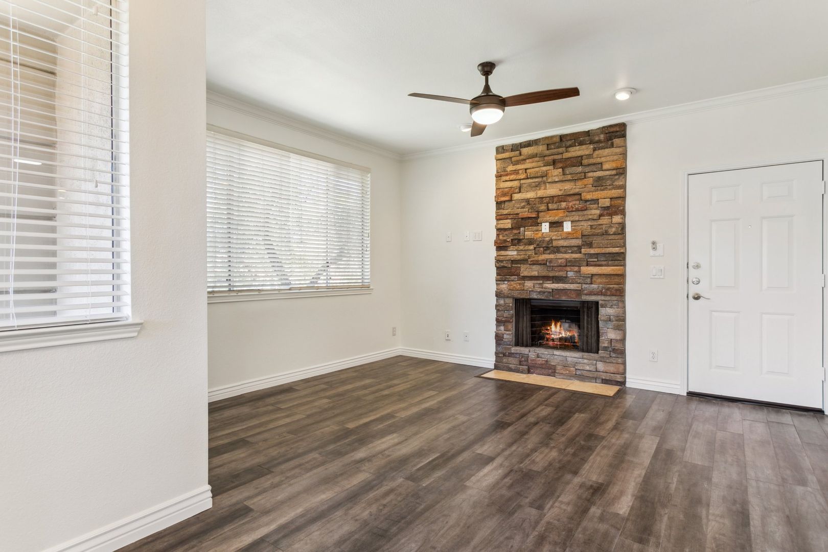 2 Bedroom 2 Bath upper level condo in North Scottsdale. Prime location with the best view overlooking the pool and golf green. Recently remodeled split floor plan, with 2 master suites, both w attached bathrooms. New Granite counter tops in the kitchen/bathrooms, stainless steel appliances, breakfast bar and a built-in wine refrigerator. Tiled shower in the master bathroom with vessel sinks and a large walk-in closet in master bedroom. Large open living area, custom lighting and wood floors throughout (no carpet) with a stone, wood burning fireplace. There are ceiling fans in all rooms and a full sized washer and dryer inside the unit. This unit also has a large corner covered, private balcony and one covered, designated parking space. Located in the gated community of The Plaza Residences which is two blocks south of Kierland Commons. Walking distance to endless, upscale shopping and restaurants. The community features two resort style swimming pools, a spa, fitness room, rec room, theater room, clubhouse and business center. Refundable Security Deposit $2050.00 due upon signing. Offered unfurnished only, minimum 12 months for $2,050.00 per month. Non-Refundable Cleaning Fee $399.00 and $50 new tenant admin fee.  $90 application fee