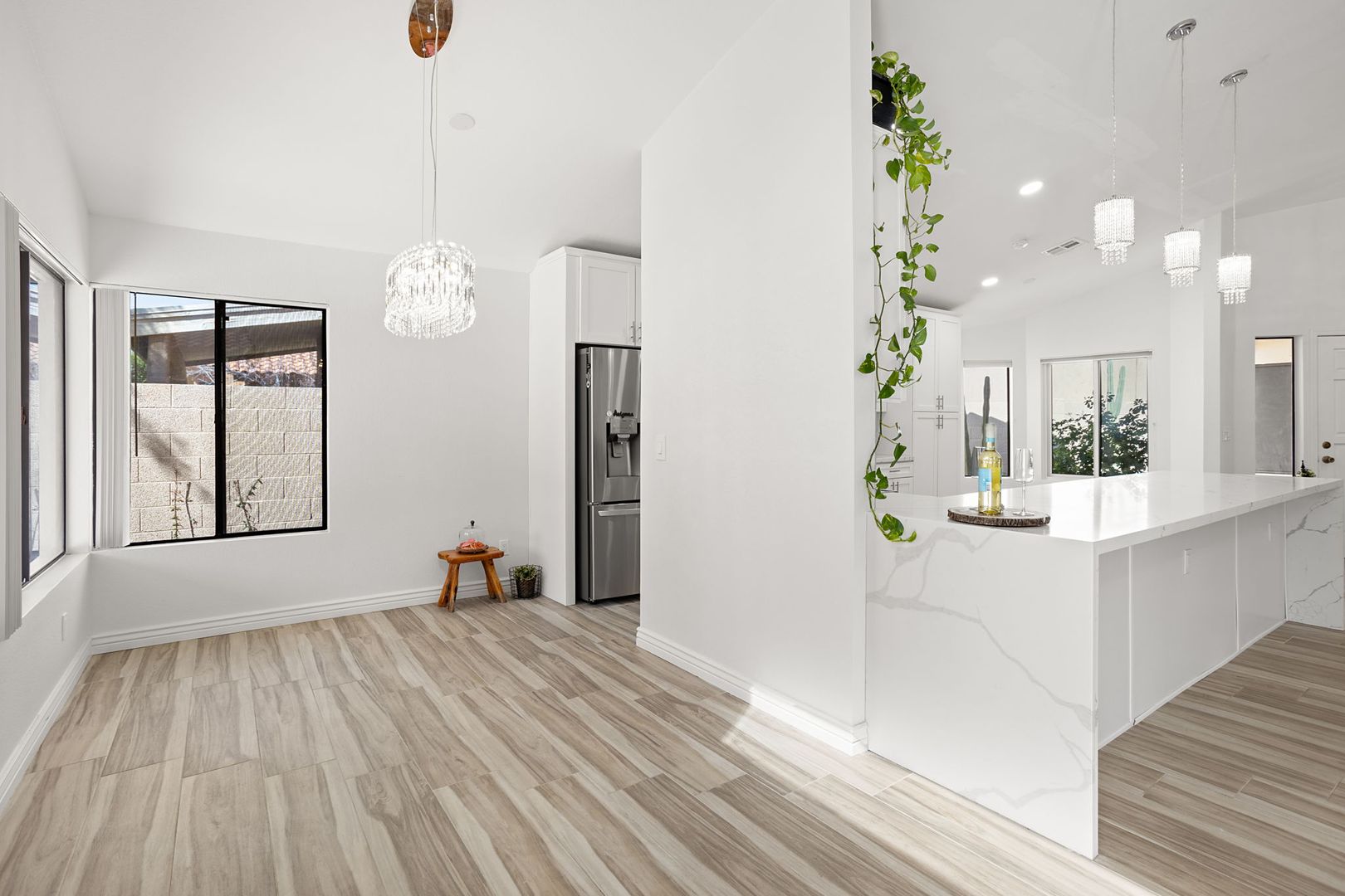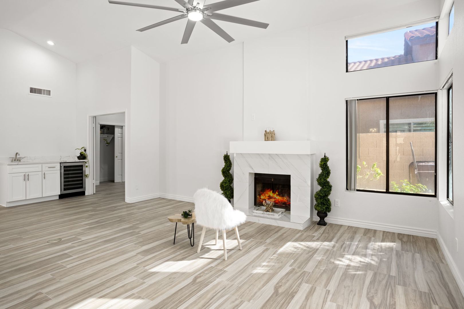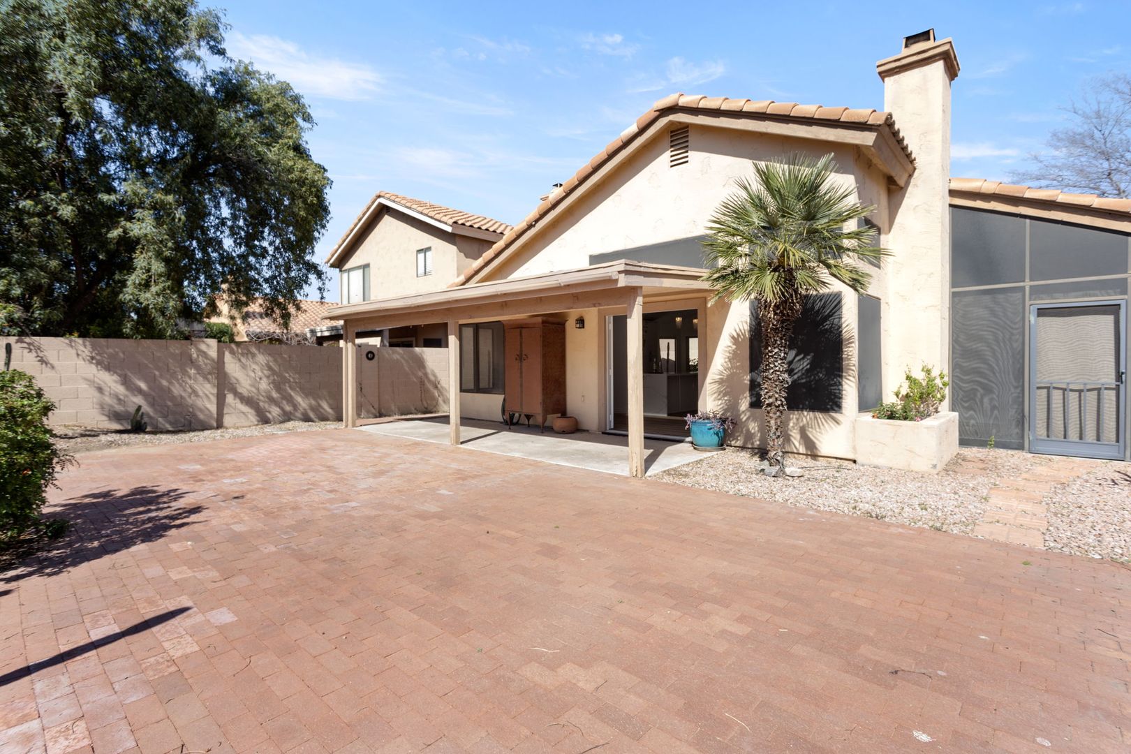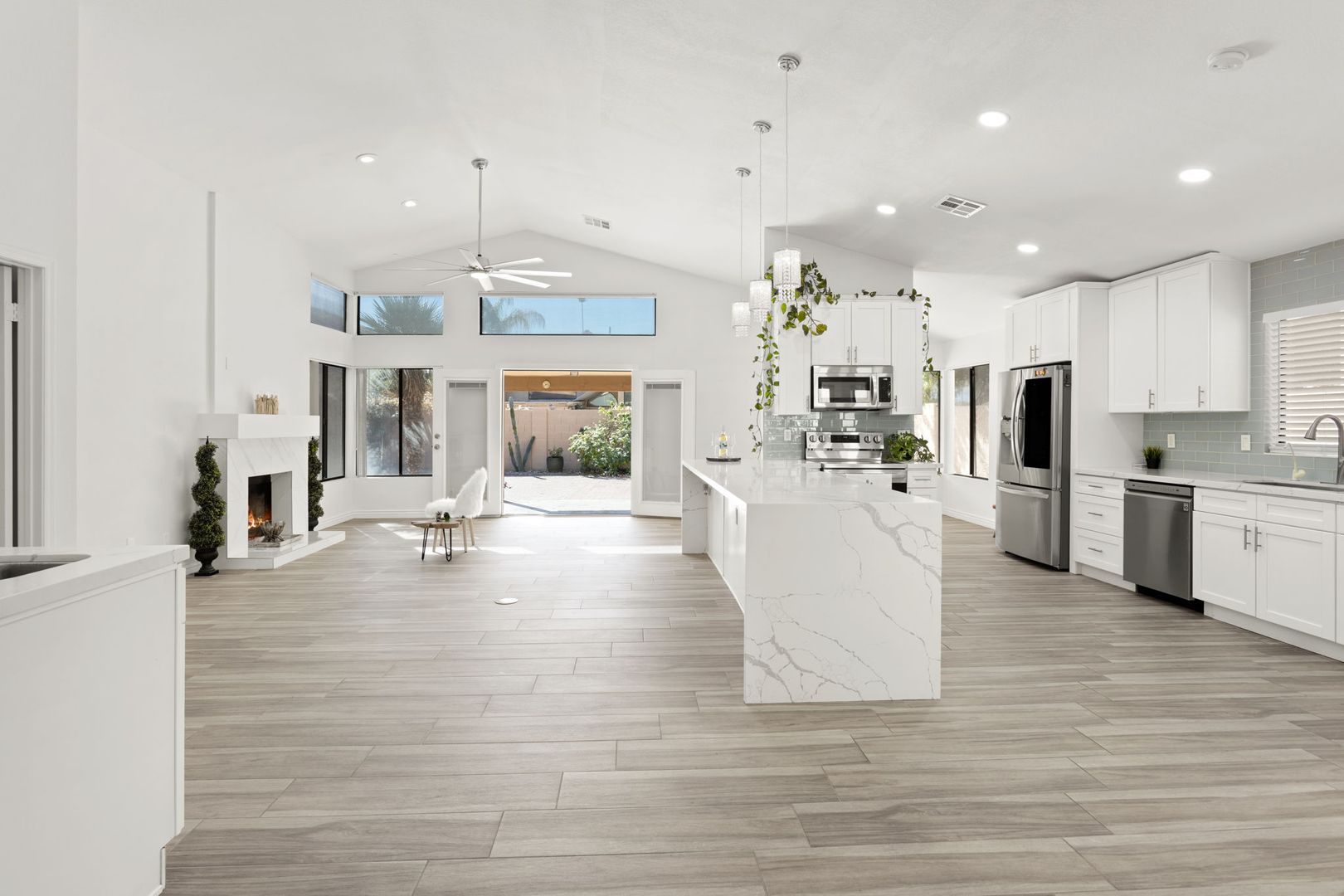 Completely remodeled, single level 3 bed 2 bath in prime Scottsdale Location! The nicest available rental in Sweetwater Ranch. Light and bright, quartz slab counters, clear view refrigerator, wood burning fireplace -wet bar with WINE REFRIGERATOR. Vaulted ceilings, North South exposure. Large master suite with his/hers sinks, 2 closets, custom-all marble-walk-in shower with rain flow feature. Other features: 2 car attached garage, separate laundry room, screened Arizona room, solar assist hot water heater, reverse osmosis drinking water. Washer, dryer refrigerator included. Home is located near community pool and spa, and backs to the walking trails.  $450 non refundable cleaning fee, $50 admin fee. 490 application fee $175 additional cleaning fee is charged if tenant uses wood burning fireplace.