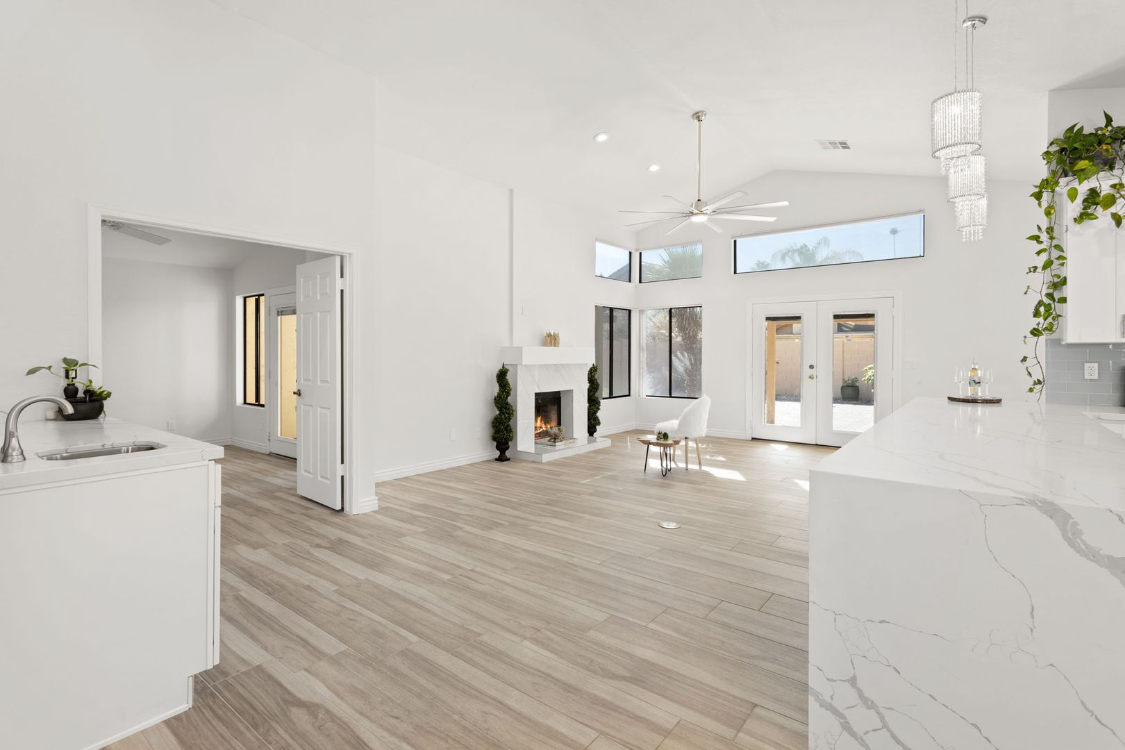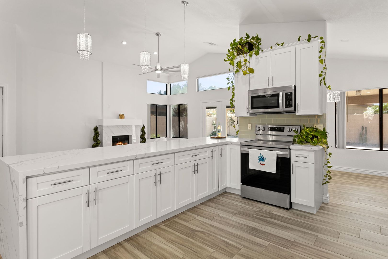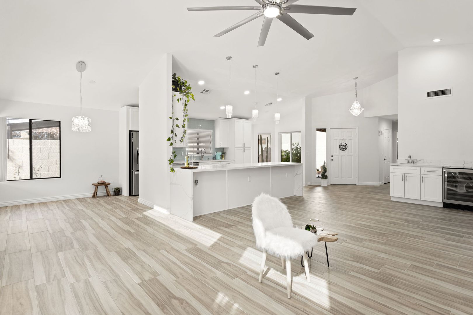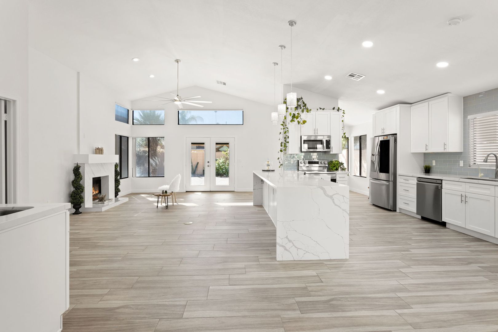 Completely remodeled, single level 3 bed 2 bath in prime Scottsdale Location! The nicest available rental in Sweetwater Ranch. Light and bright, quartz slab counters, clear view refrigerator, wood burning fireplace -wet bar with WINE REFRIGERATOR. Vaulted ceilings, North South exposure. Large master suite with his/hers sinks, 2 closets, custom-all marble-walk-in shower with rain flow feature. Other features: 2 car attached garage, separate laundry room, screened Arizona room, solar assist hot water heater, reverse osmosis drinking water. Washer, dryer refrigerator included. Home is located near community pool and spa, and backs to the walking trails.  $450 non refundable cleaning fee, $50 admin fee. 490 application fee $175 additional cleaning fee is charged if tenant uses wood burning fireplace.