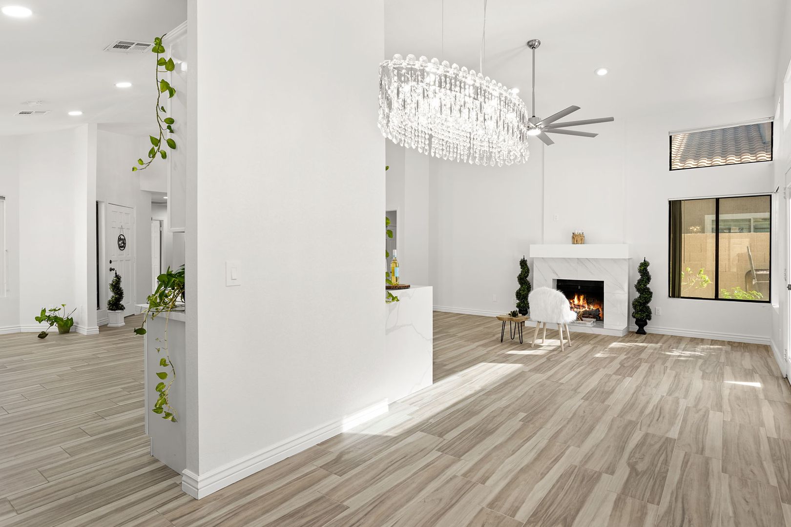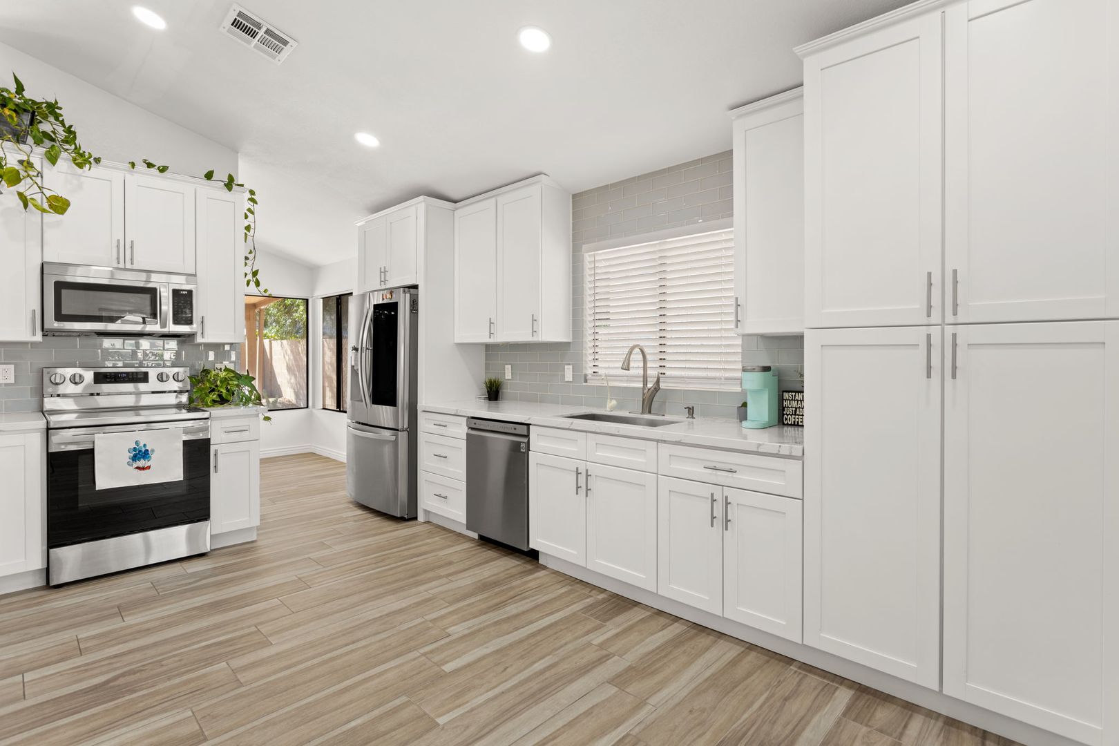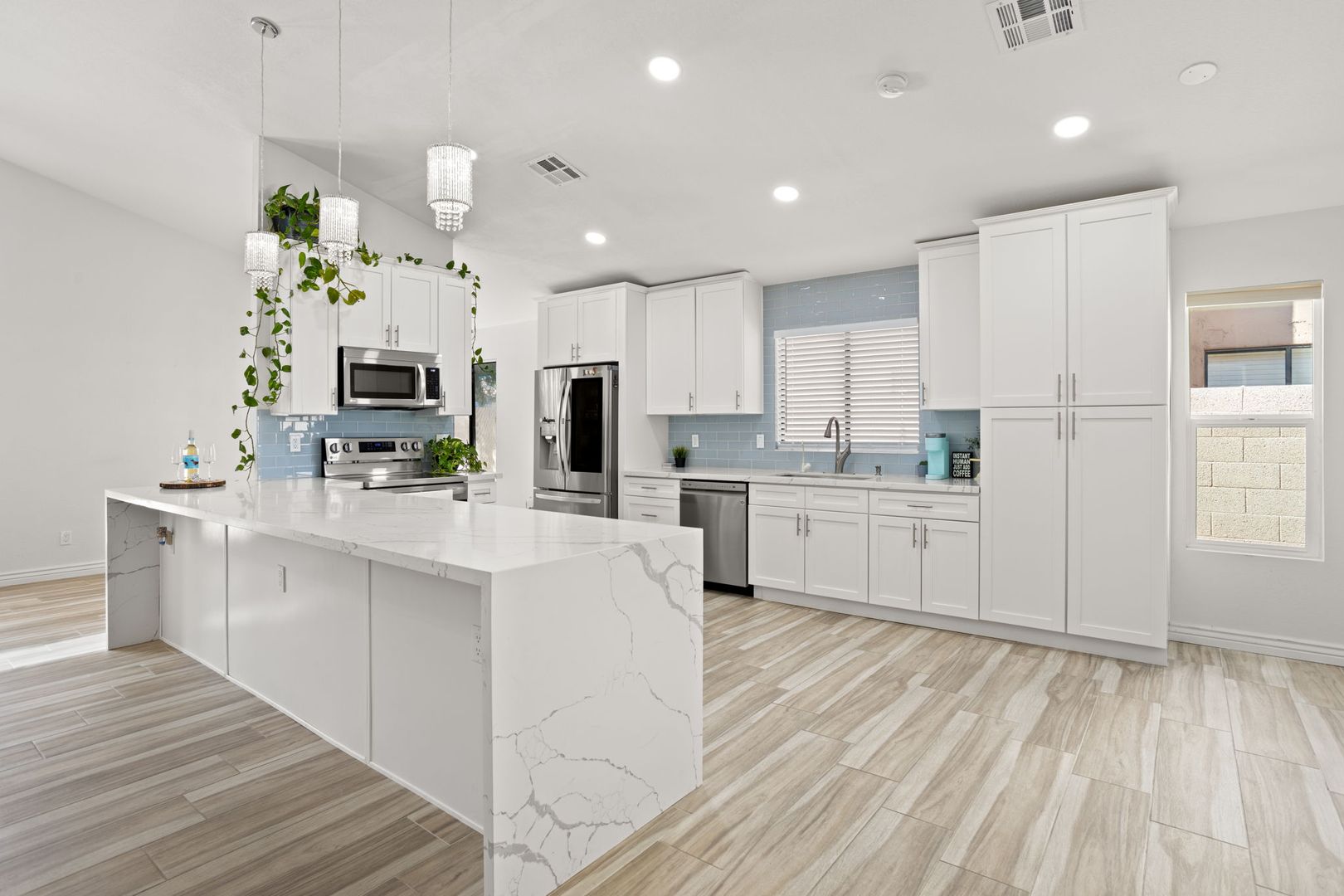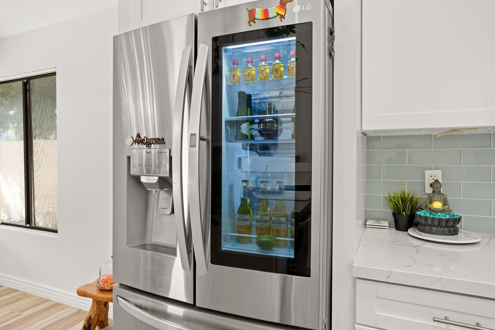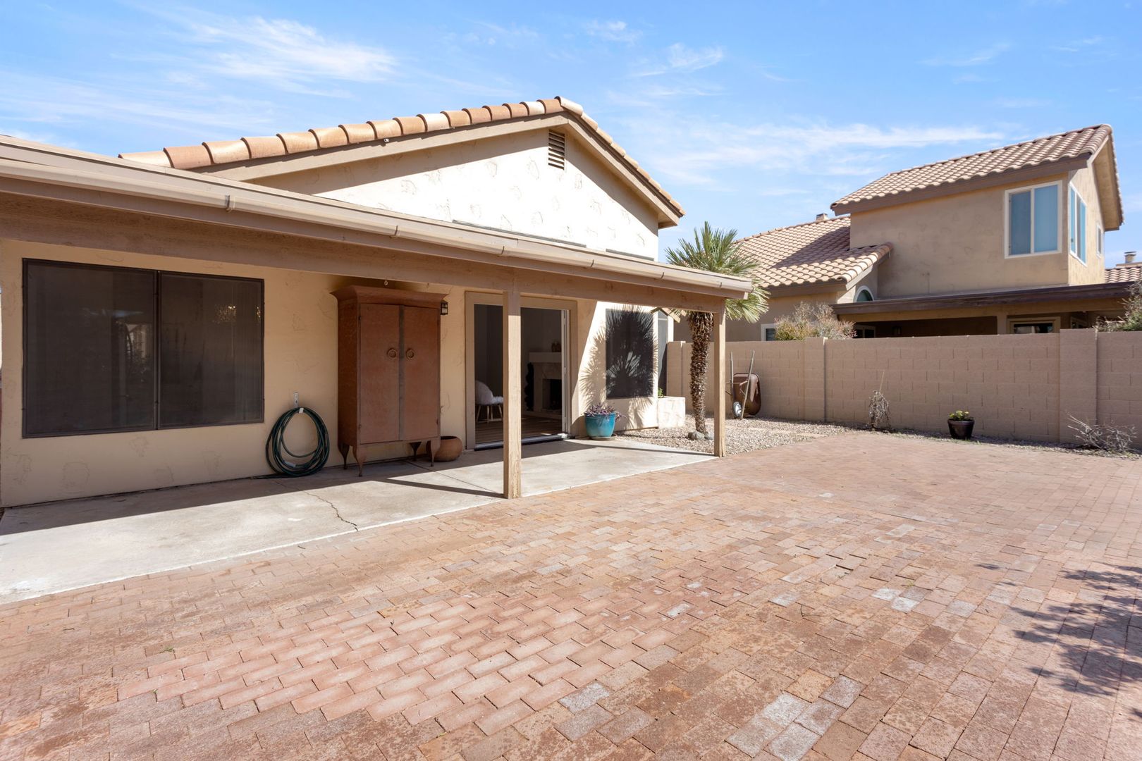 Completely remodeled, single level 3 bed 2 bath in prime Scottsdale Location! The nicest available rental in Sweetwater Ranch. Light and bright, quartz slab counters, clear view refrigerator, wood burning fireplace -wet bar with WINE REFRIGERATOR. Vaulted ceilings, North South exposure. Large master suite with his/hers sinks, 2 closets, custom-all marble-walk-in shower with rain flow feature. Other features: 2 car attached garage, separate laundry room, screened Arizona room, solar assist hot water heater, reverse osmosis drinking water. Washer, dryer refrigerator included. Home is located near community pool and spa, and backs to the walking trails.  $450 non refundable cleaning fee, $50 admin fee. 490 application fee $175 additional cleaning fee is charged if tenant uses wood burning fireplace.