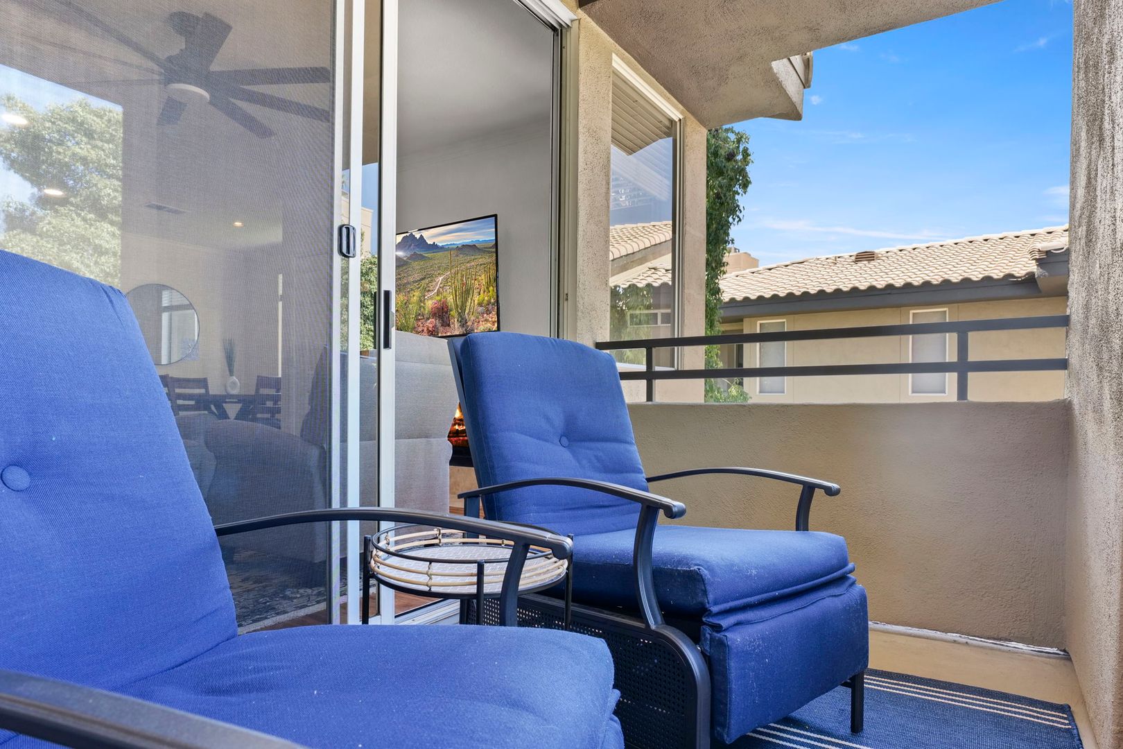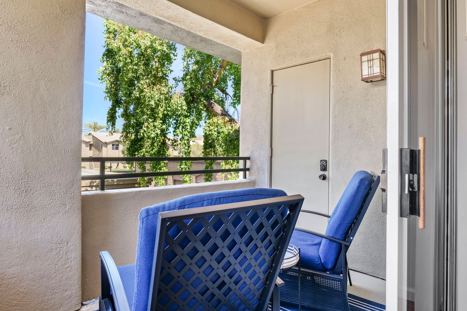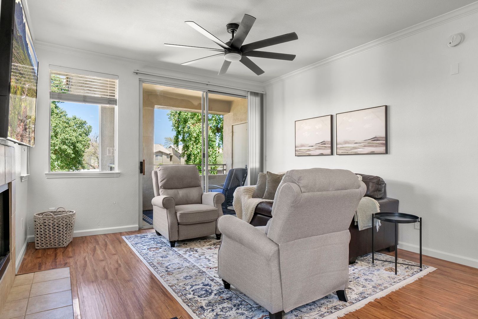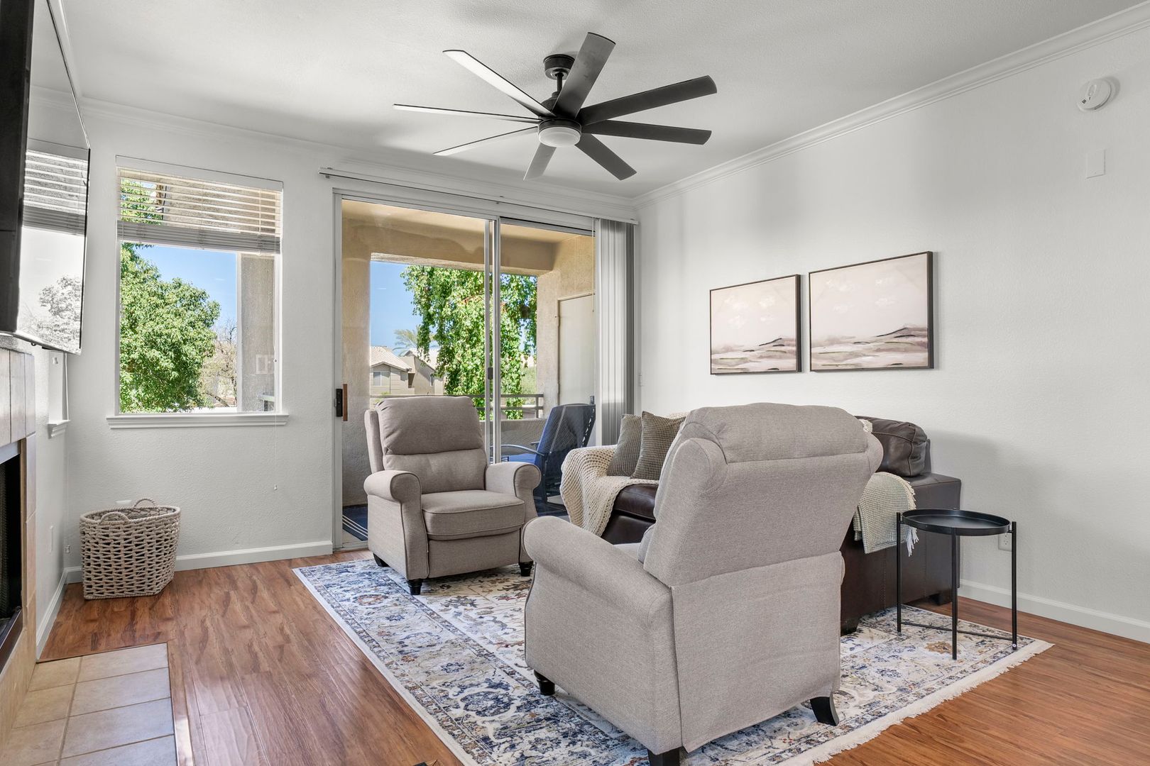 1 bed 1 bath upper level, corner unit in the gated community of The Plaza Residences. Just completed an all new furnishing package in 2023. Light and bright with wood floors throughout, wood burning fireplace can be used, but additional cleaning fee required.  2 reclining chairs, leather sofa/pull out bed and 2 smart TV’s with Wi-Fi for streaming. No cable package available. The large master suite features a king size bed and walk in closet. There is a full-size washer and dryer inside the unit, granite counter tops and stainless-steel appliances in the kitchen. Very private, North facing patio, with new patio furniture. The Plaza Residences features 2 pools, billiards, poolside Wi-Fi, fitness center, clubhouse, putting green, conference room, and business center. The ultimate Scottsdale location, just a 5-minute walk to Kierland Commons where you will find upscale shopping and dining.  Refundable security deposit equal to one month’s rent due upon signing. Rent $3,200.00 during high season Nov-Apr - $2,200.00 during low season May-Oct. Due at move-in is a non-refundable cleaning fee of $300.00 and a $50.00 non-refundable general new tenant admin fee. $75 additional cleaning fee if tenants use the wood burning fireplace.