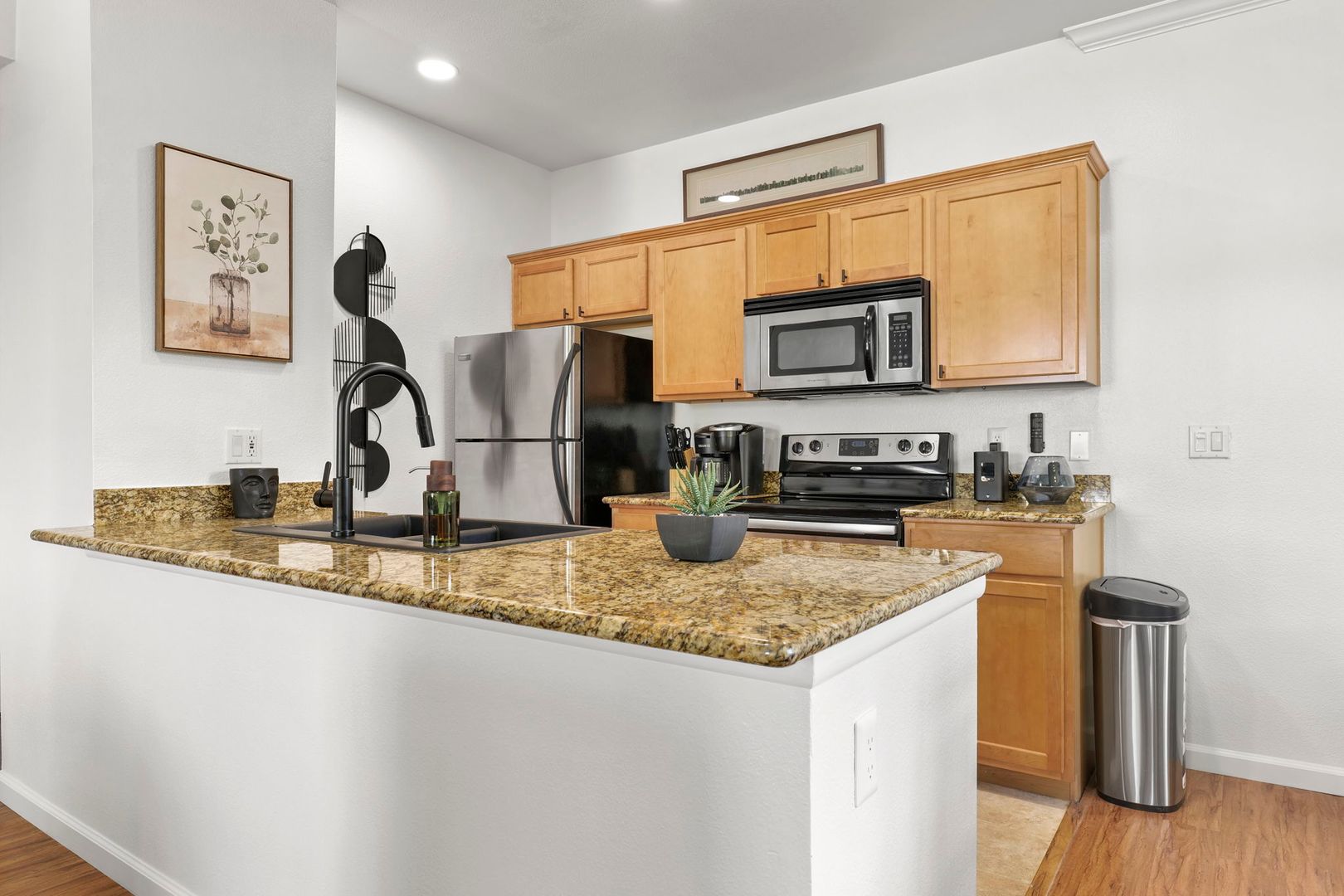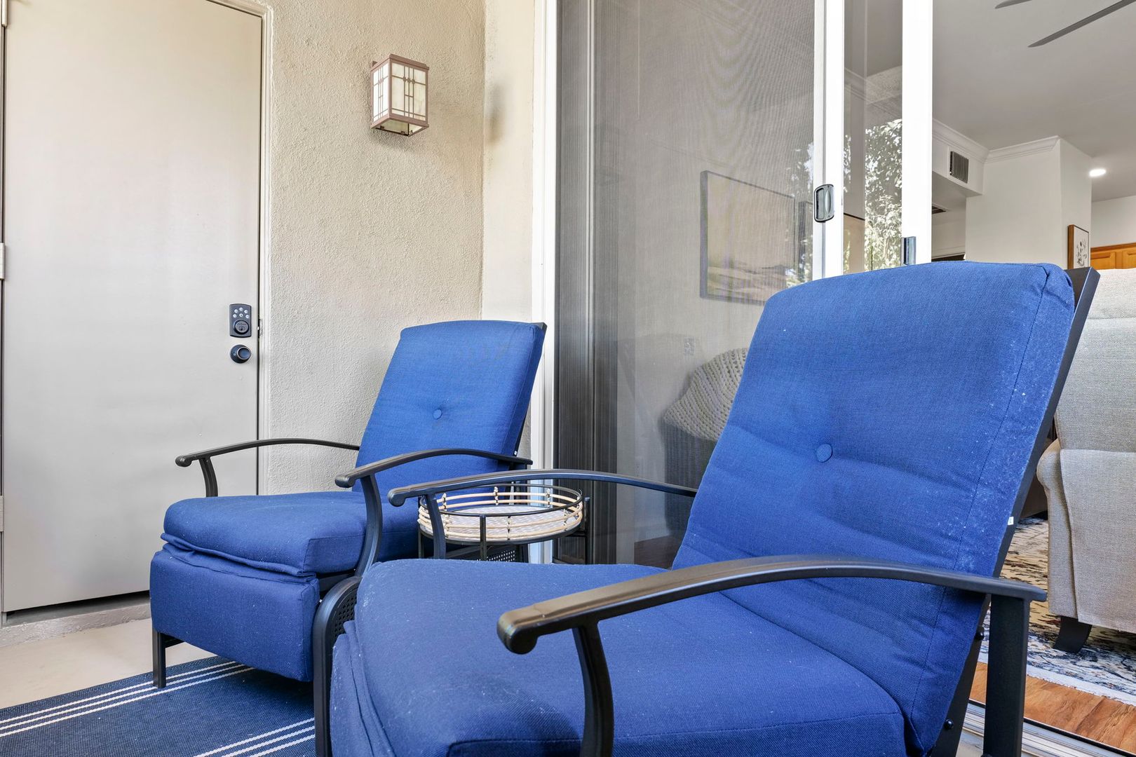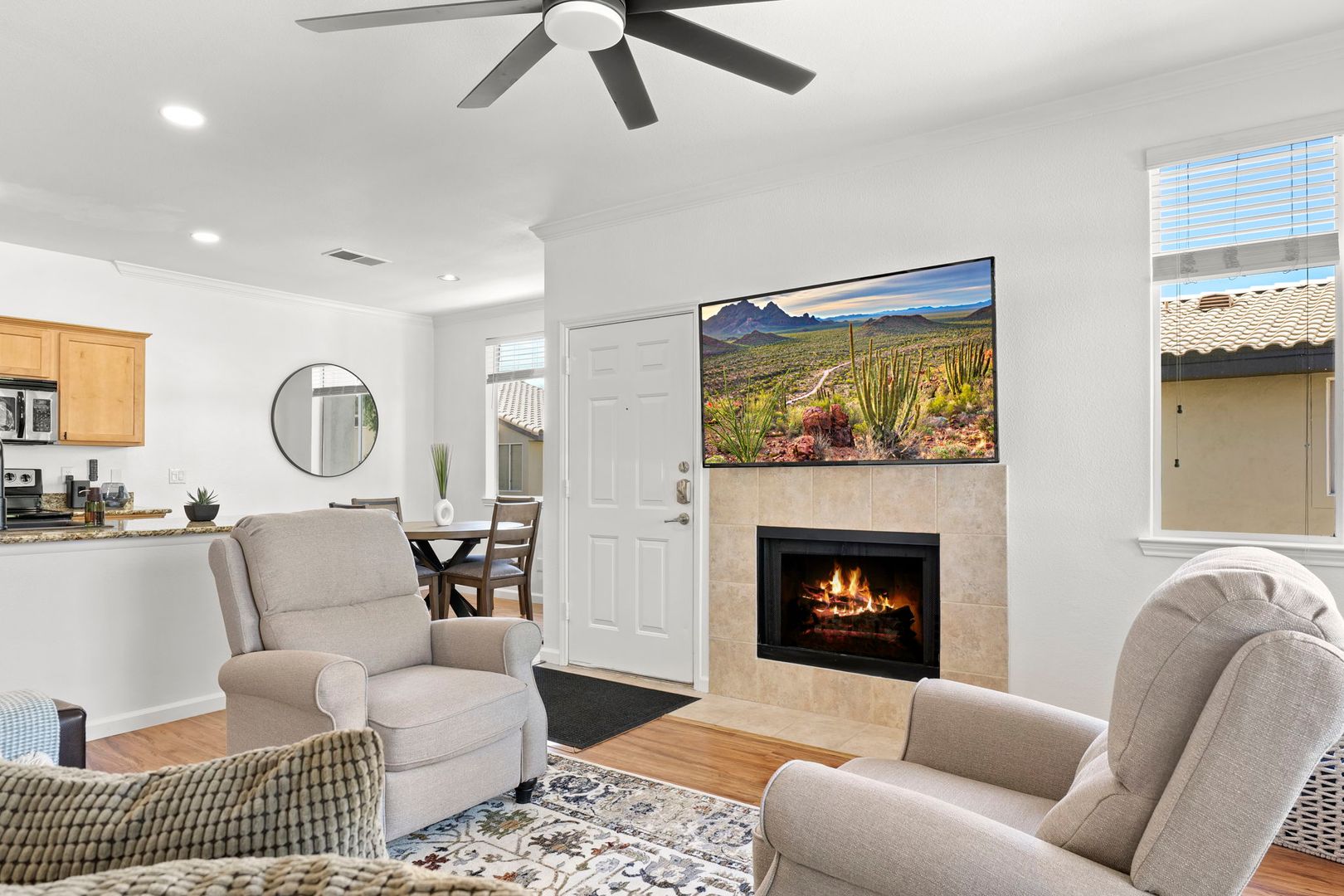 1 bed 1 bath upper level, corner unit in the gated community of The Plaza Residences. Just completed an all new furnishing package in 2023. Light and bright with wood floors throughout, wood burning fireplace can be used, but additional cleaning fee required.  2 reclining chairs, leather sofa/pull out bed and 2 smart TV’s with Wi-Fi for streaming. No cable package available. The large master suite features a king size bed and walk in closet. There is a full-size washer and dryer inside the unit, granite counter tops and stainless-steel appliances in the kitchen. Very private, North facing patio, with new patio furniture. The Plaza Residences features 2 pools, billiards, poolside Wi-Fi, fitness center, clubhouse, putting green, conference room, and business center. The ultimate Scottsdale location, just a 5-minute walk to Kierland Commons where you will find upscale shopping and dining.  Refundable security deposit equal to one month’s rent due upon signing. Rent $3,200.00 during high season Nov-Apr - $2,200.00 during low season May-Oct. Due at move-in is a non-refundable cleaning fee of $300.00 and a $50.00 non-refundable general new tenant admin fee. $75 additional cleaning fee if tenants use the wood burning fireplace.
