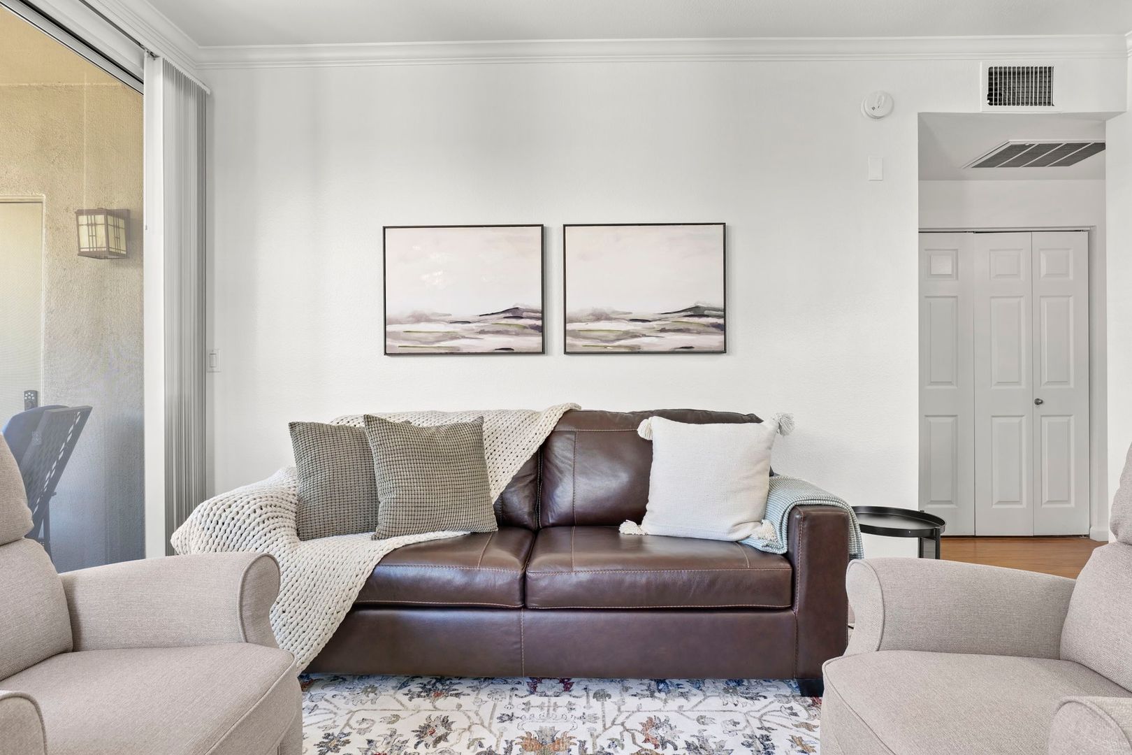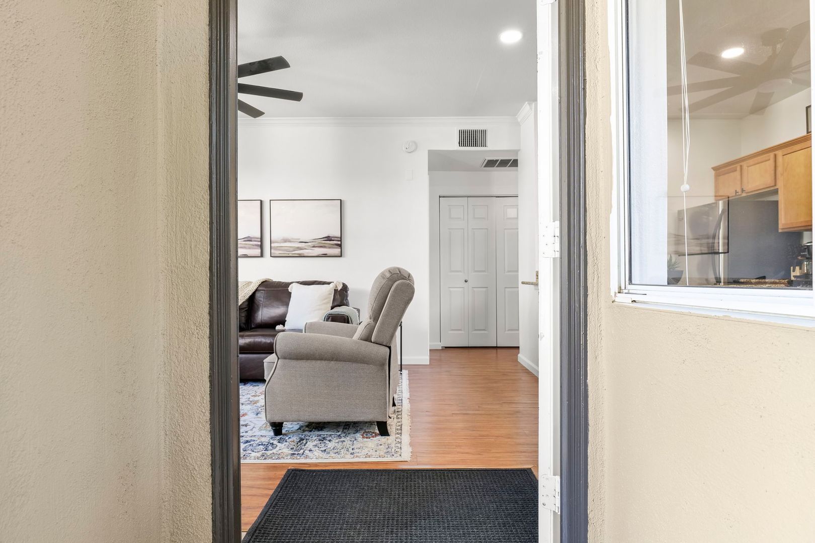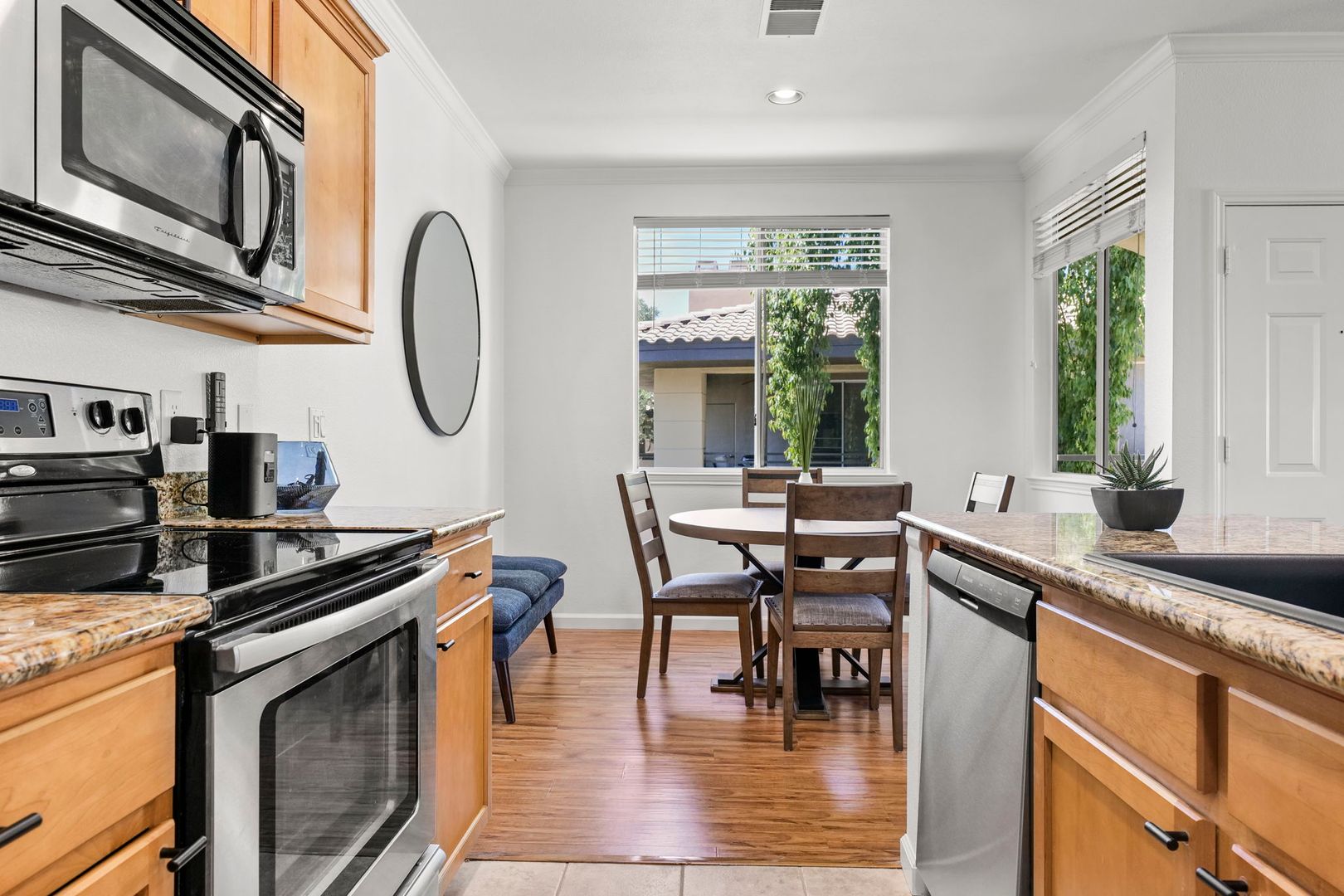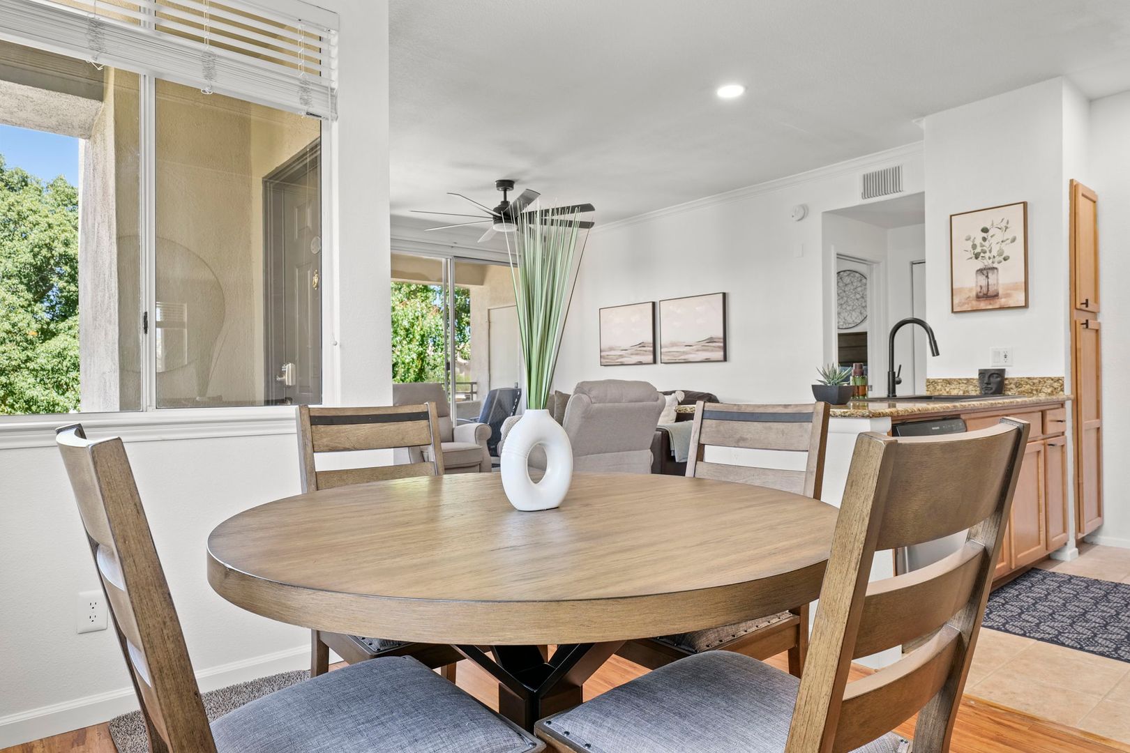 1 bed 1 bath upper level, corner unit in the gated community of The Plaza Residences. Just completed an all new furnishing package in 2023. Light and bright with wood floors throughout, wood burning fireplace can be used, but additional cleaning fee required.  2 reclining chairs, leather sofa/pull out bed and 2 smart TV’s with Wi-Fi for streaming. No cable package available. The large master suite features a king size bed and walk in closet. There is a full-size washer and dryer inside the unit, granite counter tops and stainless-steel appliances in the kitchen. Very private, North facing patio, with new patio furniture. The Plaza Residences features 2 pools, billiards, poolside Wi-Fi, fitness center, clubhouse, putting green, conference room, and business center. The ultimate Scottsdale location, just a 5-minute walk to Kierland Commons where you will find upscale shopping and dining.  Refundable security deposit equal to one month’s rent due upon signing. Rent $3,200.00 during high season Nov-Apr - $2,200.00 during low season May-Oct. Due at move-in is a non-refundable cleaning fee of $300.00 and a $50.00 non-refundable general new tenant admin fee. $75 additional cleaning fee if tenants use the wood burning fireplace.